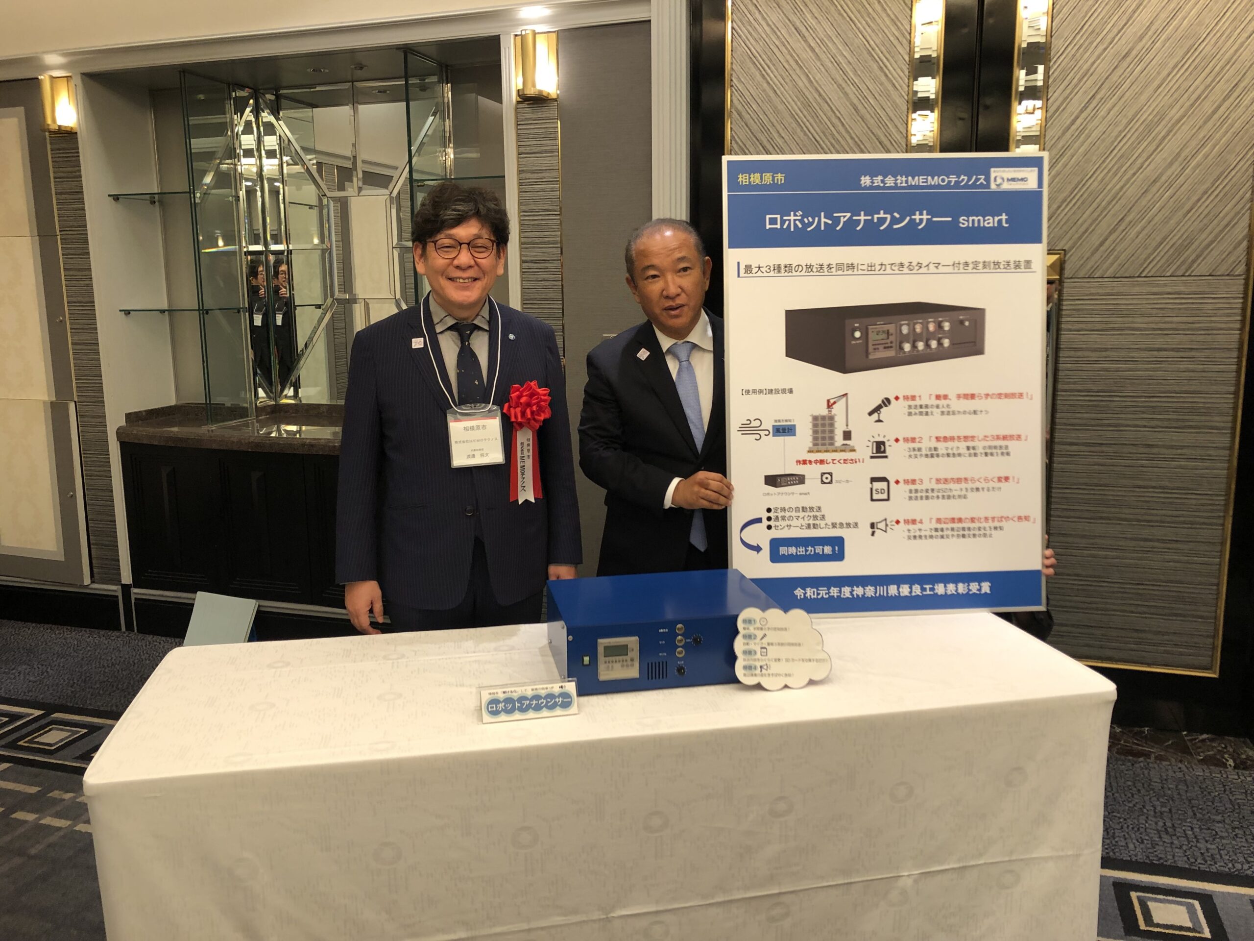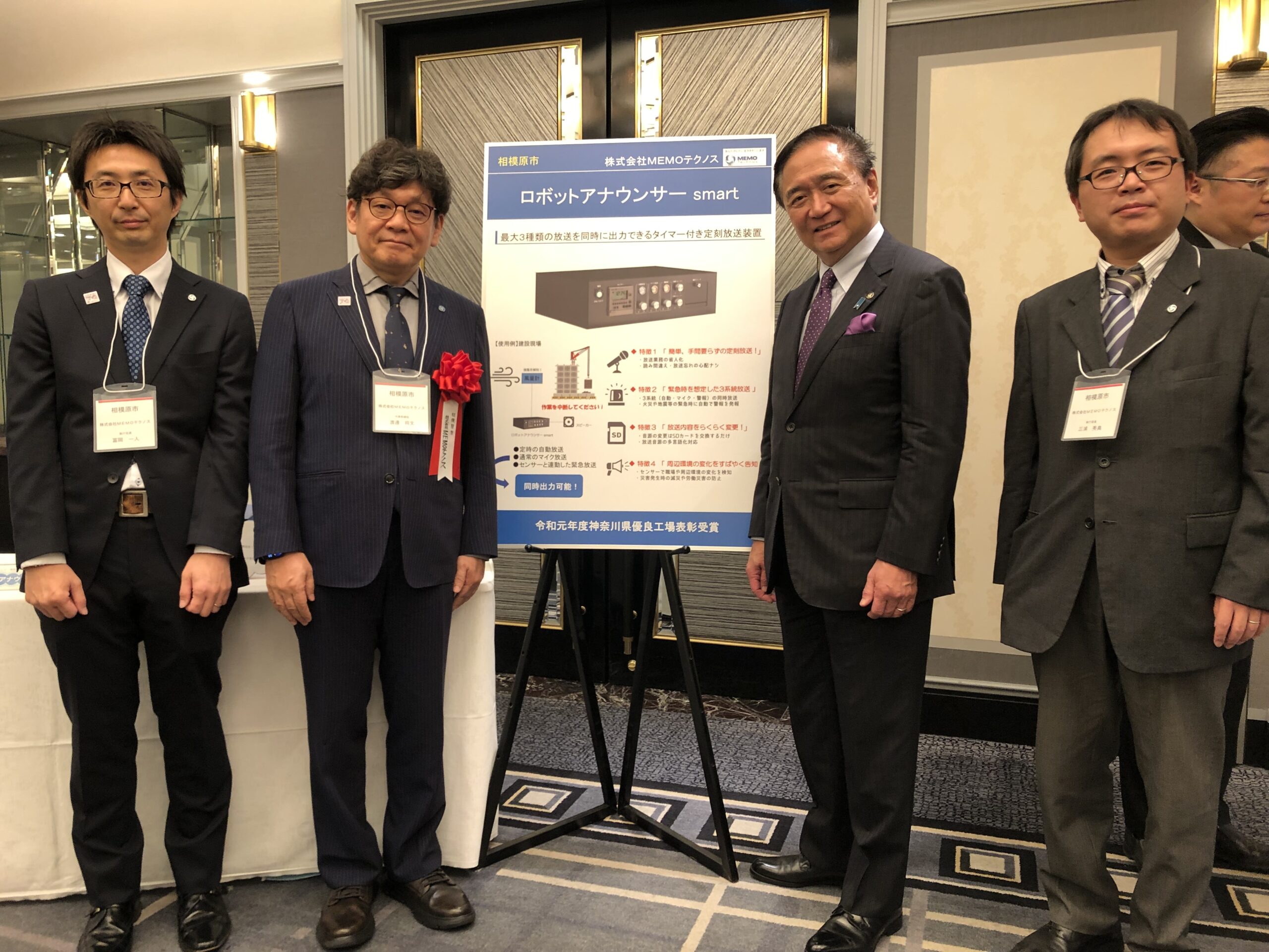 令和6年10月28日、第86回九都県市首脳会議にて令和6年「九都県市のきらりと光る産業技術」の表彰がホテルニューオータニ幕張にて開催され、相模原市長の推薦を受け弊社の「ロボットアナウンサー smart」が受賞をいたしました。